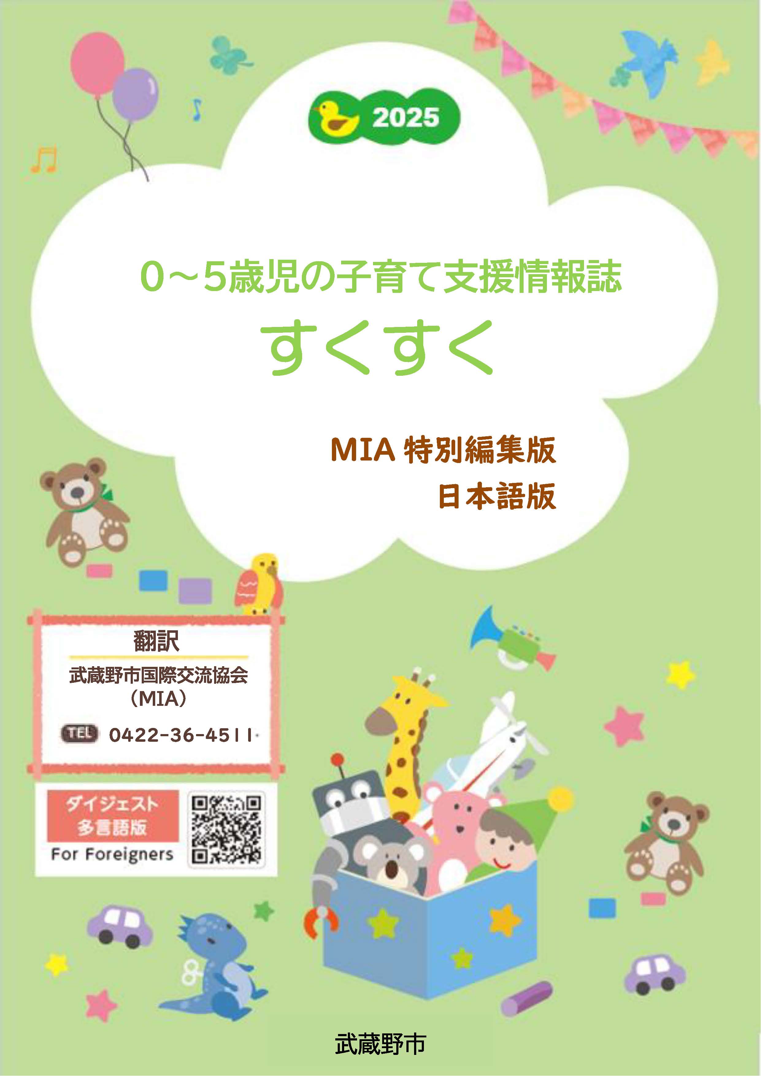 Thanks to the cooperation by foreign volunteers who experienced raising children in the community, MIA edited child rearing information based on “Suku-suku ;Child Care Information Magazine”, issued by Musashino City, and translated it into various languages. If you are a foreign resident who feel it’s difficult to get or utilize local child care support information, please make use of it.